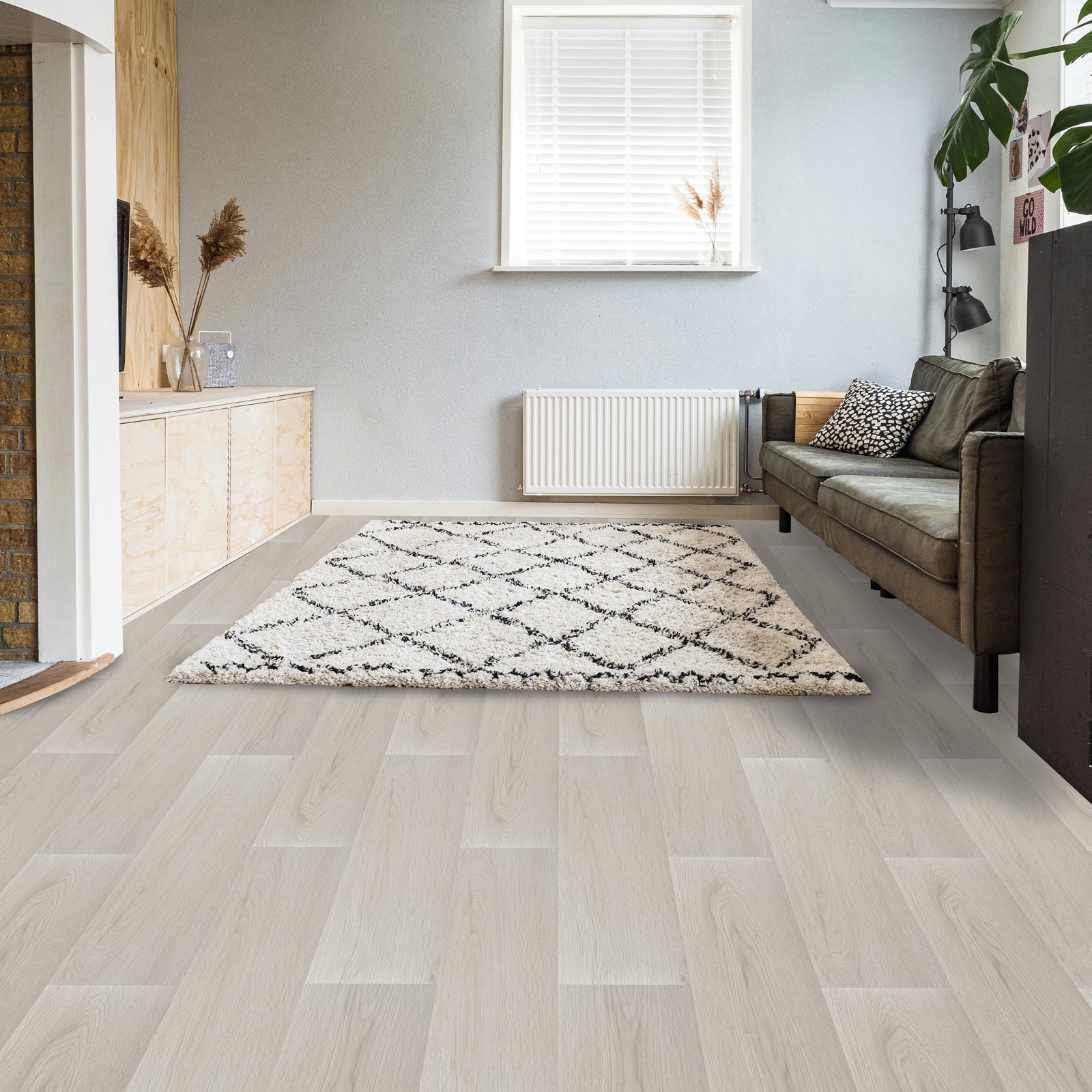 IvoryDriftwood vinyl flooring sticks on easily and quickly, giving your room a bold new look fast.